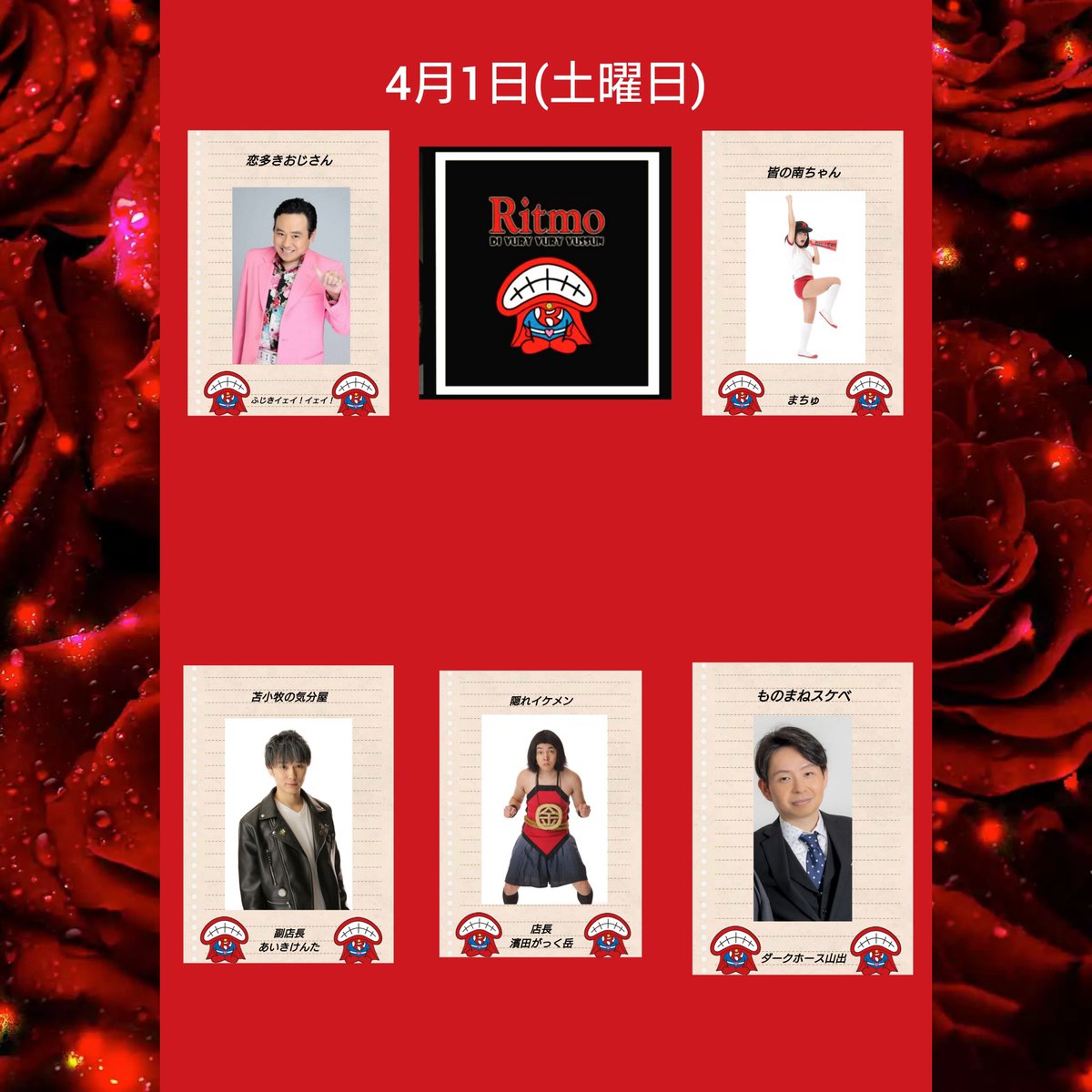 ✨本日の出演者✨ 店長 濱田がっく岳 あいきけんた シンディー ジャンふじたに(2部のみ) ダークホース山出 となっております! 御予約は03-5445-4015かDMまで💋 https://t.co/e09MRwCA8N