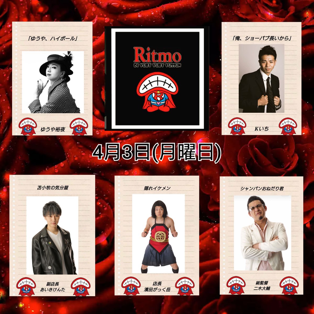 ✨本日の出演者✨ 総監督 二木大輔 店長 濱田がっく岳 あいきけんた まちゅ むらせ ダークホース山出 となっております! 御予約は03-5445-4015かDMまで💋 https://t.co/sVOumqBtgl