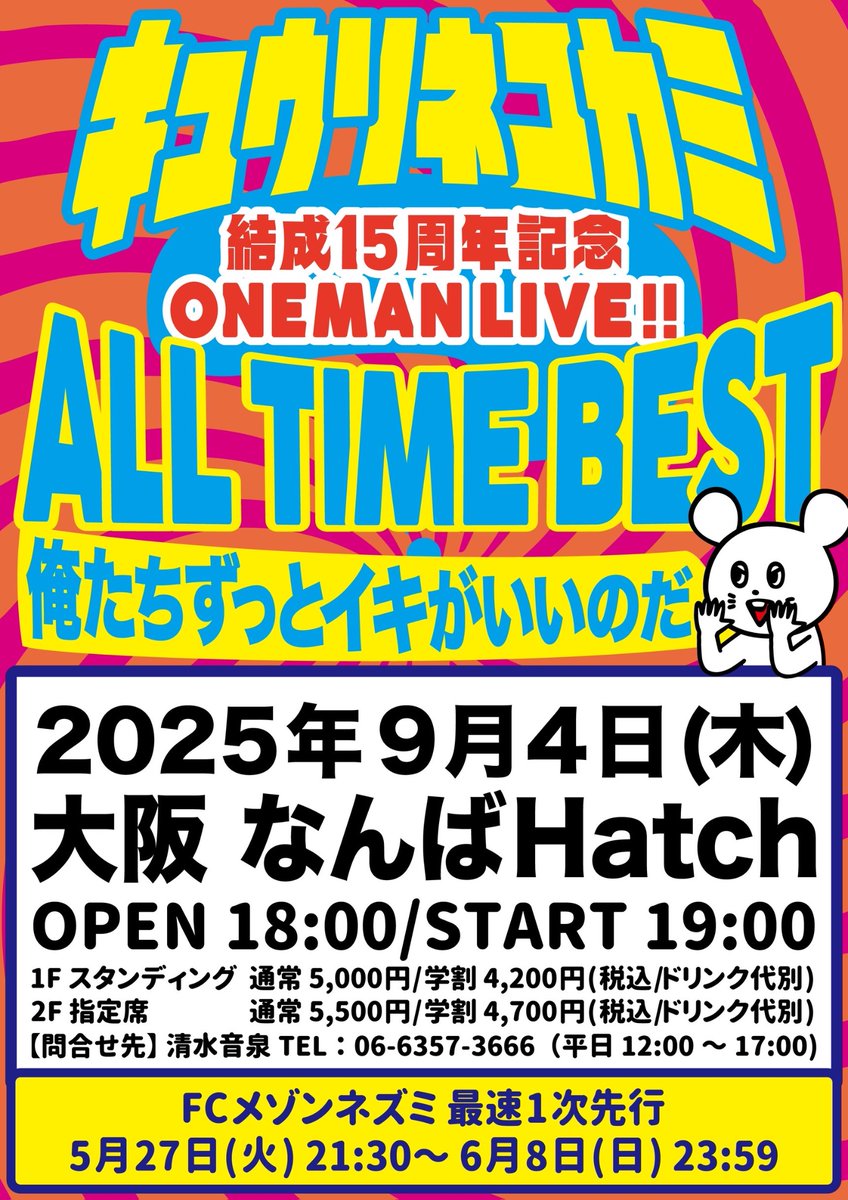 【開催決定!!】 ◾️9/4(木) @ なんばHatch 「キュウソネコカミ 結成15周年記念 ONEMAN LIVE!! - ALL TIME BEST 俺たちずっとイキがいいのだ-」 キュウソの結成15周年を記念した スペシャルワンマンライブ開催決定ー㊗️✨ ▼ 最速FC1次先行受付チュー‼️ https://t.co/MtgP0bKwTr ※6/8(日)23:59迄 https://t.co/qimZe9YJKW