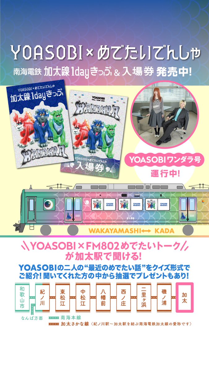 ぜひ、YOASOBI ワンダラ号に乗って、加太駅に足をお運びくださいね。🚃https://t.co/goF4jTAt59#YOASOBI_WANDARA https://t.co/aJFppb2BJW pic.twitter.com/4JuVcnnONR