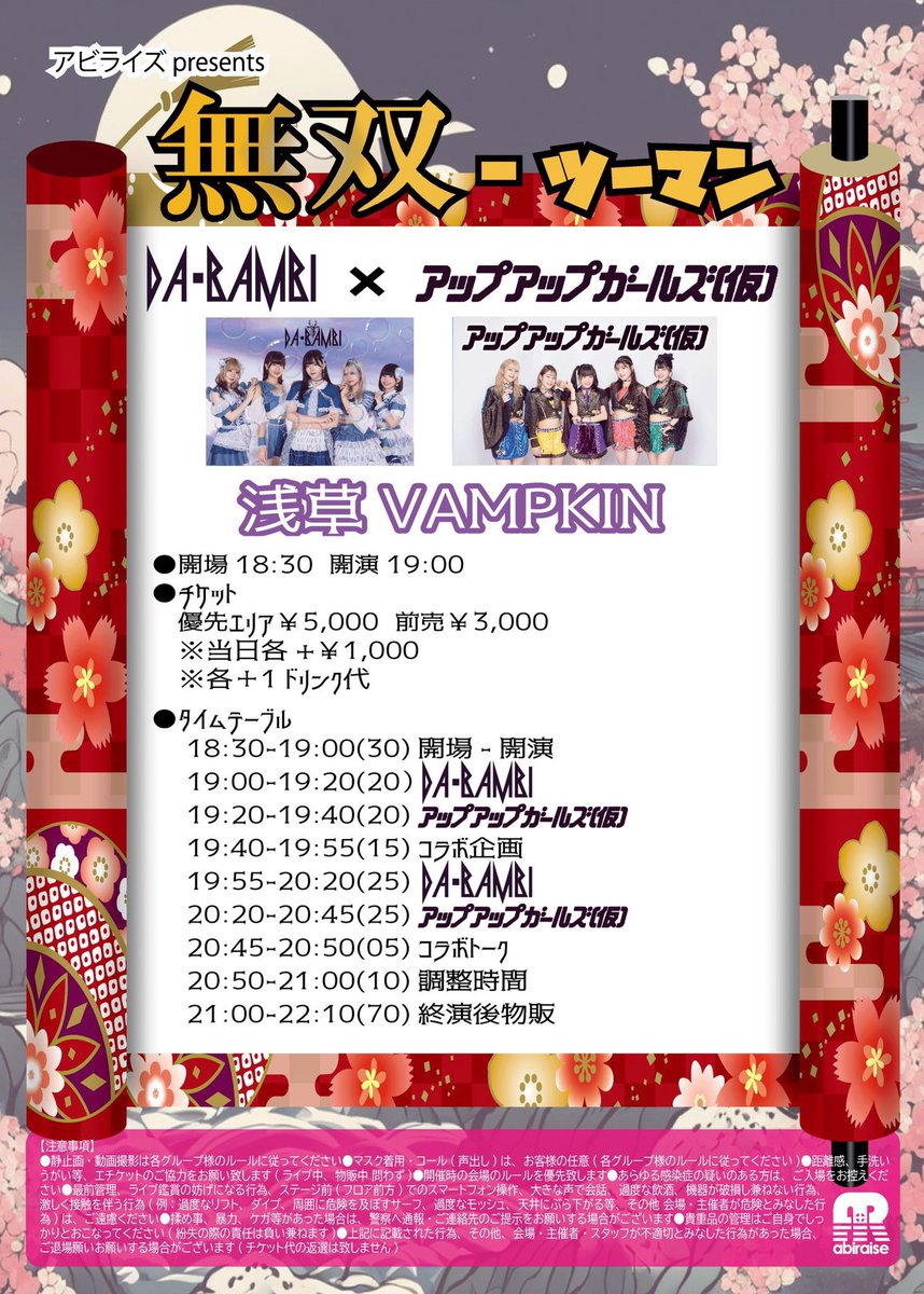 明日はこちら‼️ 「無双-ツーマン」 ■日時:3月4日(火) 開場18:30 開演19:00 ■会場:浅草VAMPKIN ■出演者:DA・BAMBI × アップアップガールズ(仮) チケット🔽 https://t.co/jENZtYOrMH 皆様ぜひお越しください! #アプガ https://t.co/6kcg4WUnxi