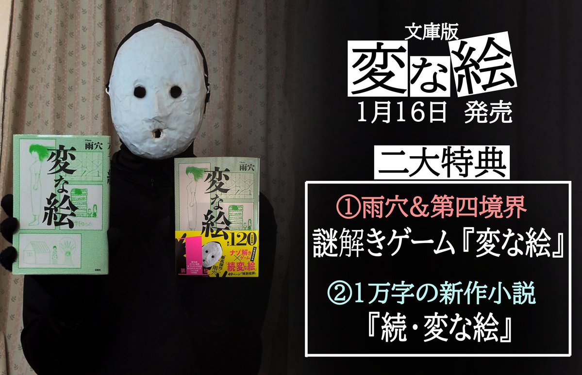 1月16日 雨穴の小説『変な絵』が文庫化(小さくて安い本)されます 文庫特典 ①雨穴&第四境界『謎解きゲーム 変な絵』 ②1万字の新作小説『続 変な絵』 本編では描かれなかった真相が明らかになります https://t.co/kvWsVi8w79