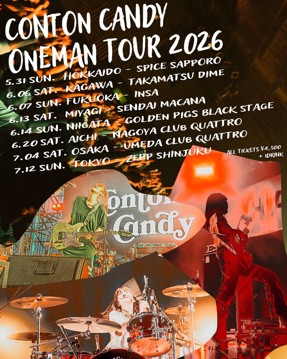 【みんなにシェアして!】 Conton Candy ONEMAN TOUR 2026 オフィシャル先行受付中! 5/31 札幌SPiCE 6/6 高松DIME 6/7 福岡INSA 6/13 仙台MACANA 6/14 新潟GOLDEN PIGS BLACK STAGE 6/20 名古屋CLUB QUATTRO 7/4 梅田CLUB QUATTRO 7/12 Zepp Shinjuku 🎟️12/7(日)23:59まで https://t.co/se7xYBcdQQ https://t.co/maORTKBjY8
