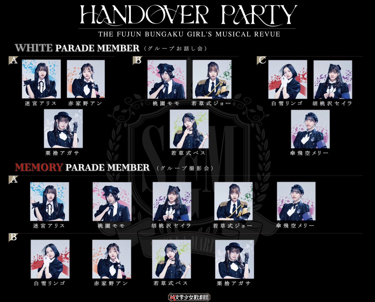 HANDOVER PARTYに関しまして 特典券に記載されているメンバーの写真が間違っておりました。 ご購入時にご説明はさせて頂いておりますが、アルファベットとこちらの画像にて参加メンバーをご確認ください。 ご迷惑をお掛け致しますが、宜しくお願いいたします。 #x純文学少女歌劇団 https://t.co/JASob3rutq https://t.co/VJY62c0ffx