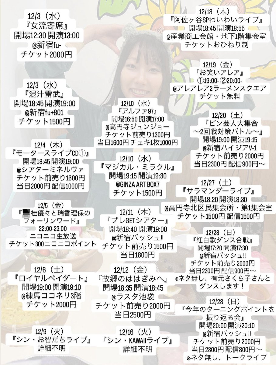 🎅12月ライブ予定🎄 不備があったので再投稿です🙇♂️ あっという間に2025年もお終いです❕悔いのないように過ごしたい🌠 どのライブも大体お取り置き🉑、出来ないものはご予約URL等送らせていただくのでリプ・DMにてお問い合わせ下さい👩🌾 12月もよろしくお願いしますー!!❄️ https://t.co/M2SxfhNRdT https://t.co/4vDbDMn8pu