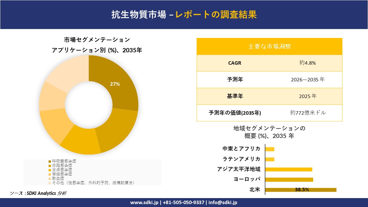 東京都渋谷区、2025年12月23日:SDKI Analyticsはこのほど、「 抗生物質市場に関する調査レポート : 予測2026―2035年」を発行しました。調査レポートは、 抗生物質市場の成長に貢献する統計的および分析的アプローチに焦点を当てています。当社の読者は、現在の市場シナリオに関する明確なイメージを得るとともに、詳細な調査レポートで提供される主要な業界の洞察から将来の傾向についても理解します。抗生物質市場に関するこの調査レポートは、一次調査方法と二次調査方法の両方を利用して、市場の成長に伴う現在および将来の市場動向を分析します。