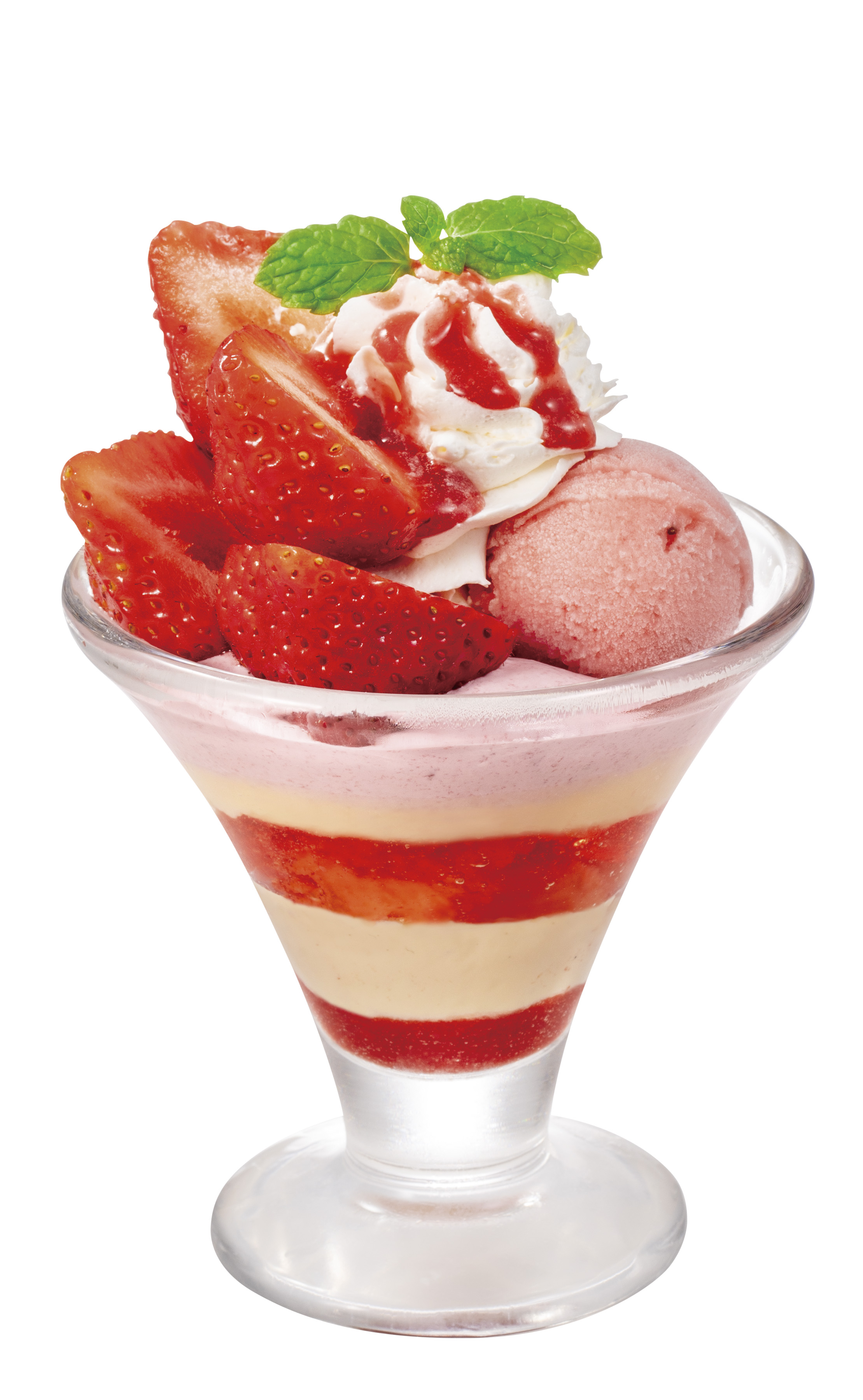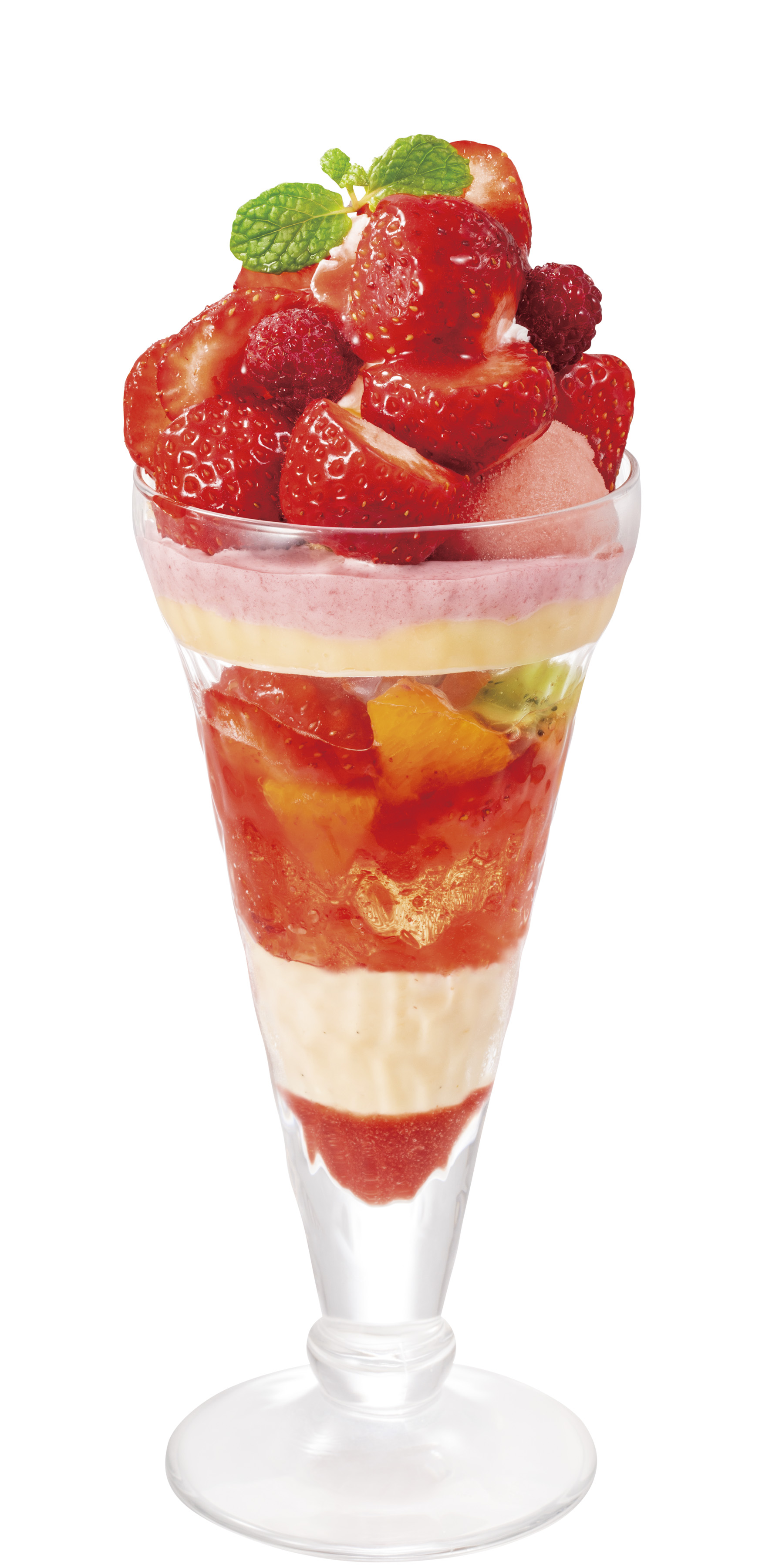 赤、白、ピンクに彩られた、見た目もキュートなパルフェ♪ フレッシュないちご、甘酸っぱいソルベ、なめらかなクリーム、ふるふるとした食感のゼリー、フルーティなソースと、いちごを使った素材をバラエティ豊かに盛り合わせました。クレームパティシエールやバニラアイスが、爽やかないちごの風味にまろやかな甘さをプラス。ほどよいボリュームなので、サンデーは食べきれないという方にもおすすめです。