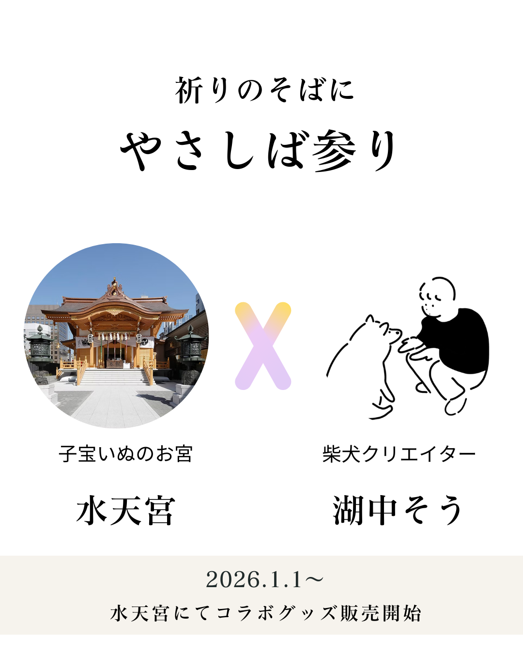 この子宝いぬの像にちなみ、柴犬を描くイラストレーターの湖中そう氏とのコラボ企画を2026年1月1日から開始します。本コラボ企画では、「ポストカード」「木製スタンプ」「フレークシール」の限定グッズを水天宮内の「子宝丸本舗」にて販売いたします。