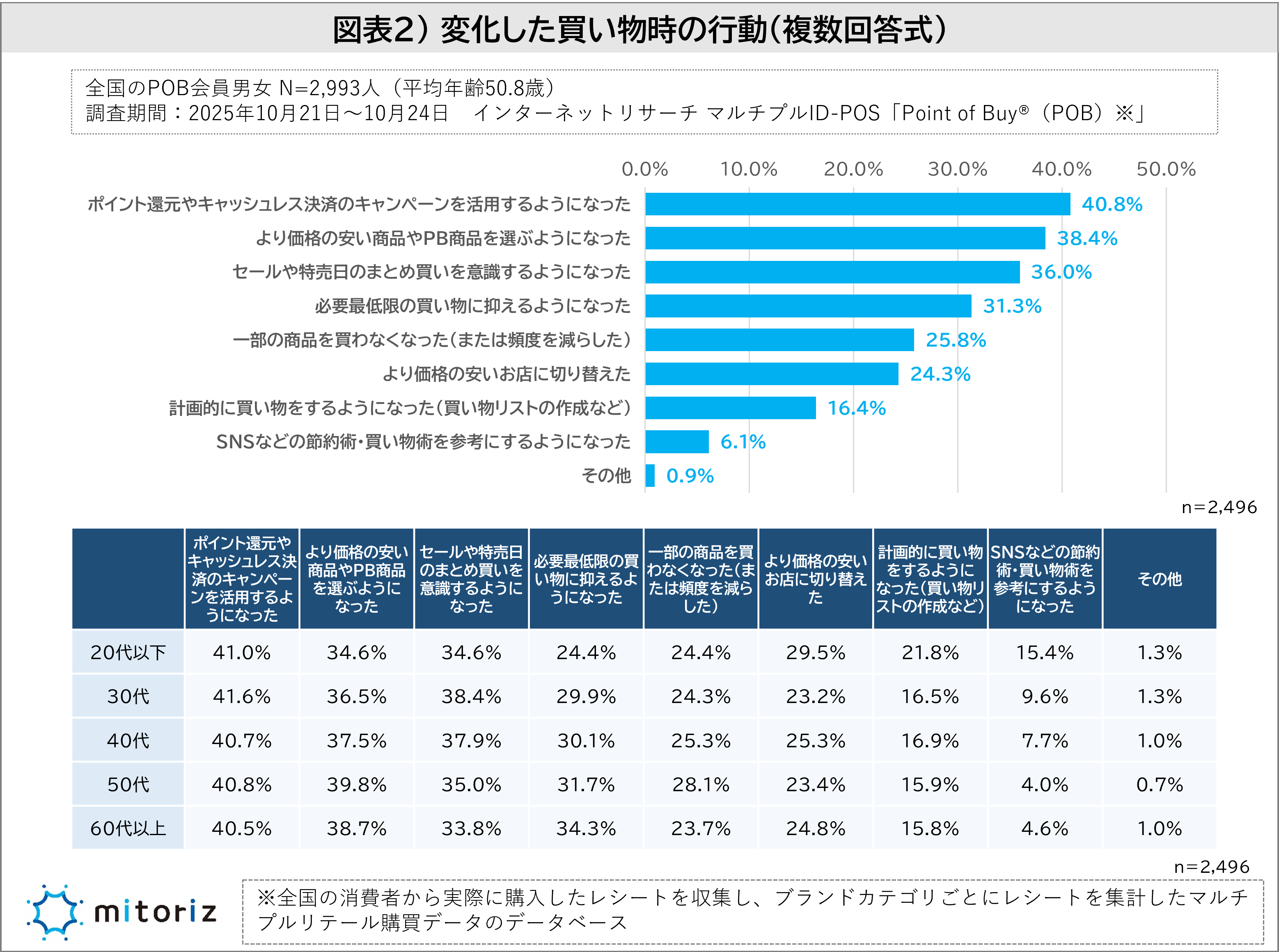 年代別にみると、60代以上では「必要最低限の買い物に抑える」の割合が他年代よりやや高く、支出だけでなく購入量そのものを見直す慎重な買い物スタイルが目立ちます。20代以下は「より価格の安い店に切り替えた」「計画的に買い物をする」といった項目の数値が相対的に高く、行動範囲や買い方を柔軟に変えながら支出をコントロールする姿勢が特徴的といえそうです(図表2)。