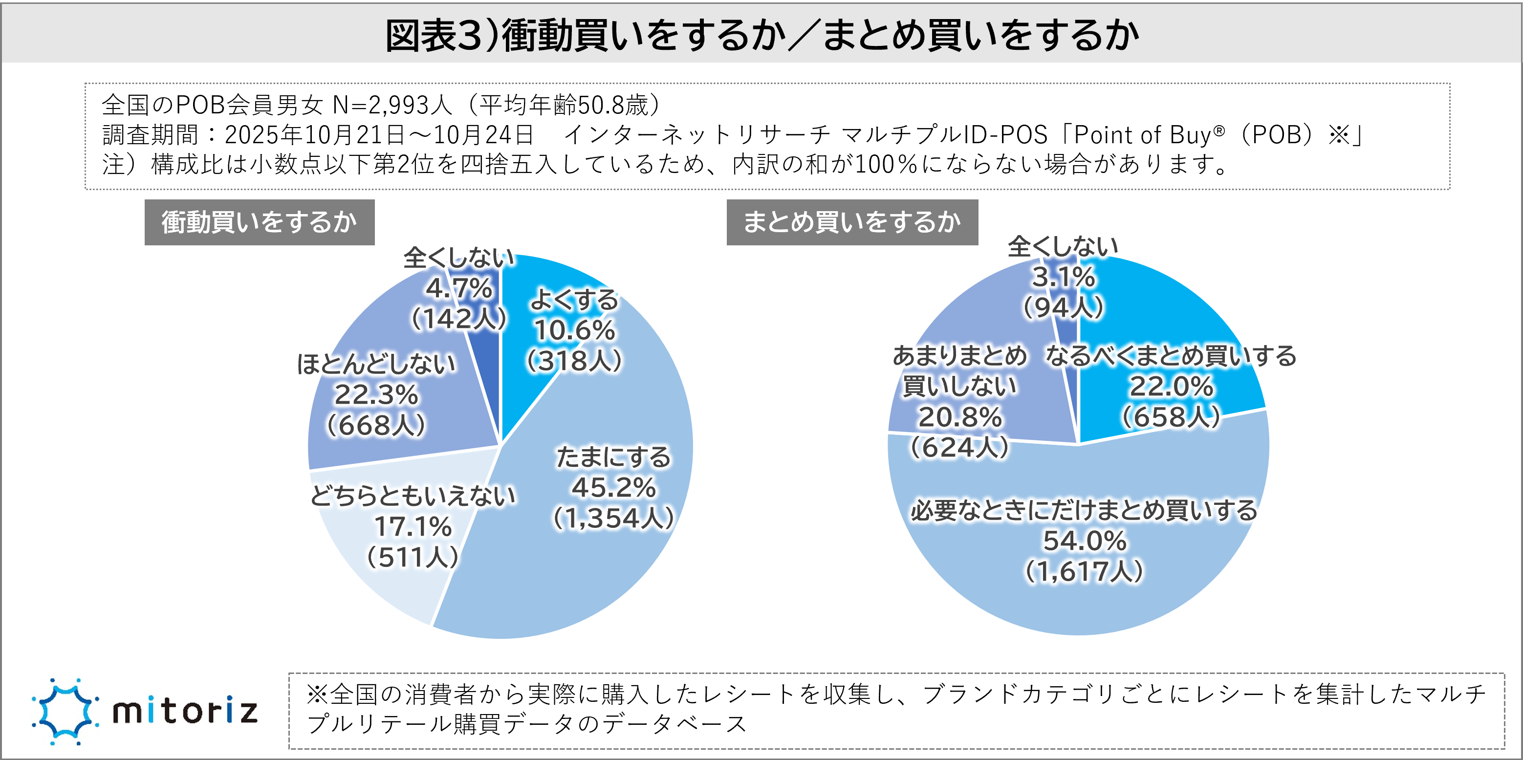 「衝動買い・まとめ買いをするか」について調査したところ、衝動買いは「よくする」(10.6%)に「たまにする」(45.2%)を加えると、過半数が日常的に衝動買いを経験していることがわかりました。一方、まとめ買いについては「なるべくまとめ買いをする」(22.0%)に「必要なときにだけまとめ買いをする」(54.0%)を合わせると、約8割にのぼり、多くの人が状況に応じてまとめ買いを取り入れている様子がうかがえます(図表3)。