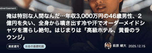 【メディア掲載】東京財託グループ代表・萩原峻大氏の解説コラムが幻冬舎ゴールドオンラインに掲載 俺は特別な人間なんだ…年収3,000万円の46歳男性、2億円を失い、全身から噴き出す冷や汗でオーダーメイドシャツを濡らし絶句。はじまりは「高級ホテル、黄昏のラウンジ」
