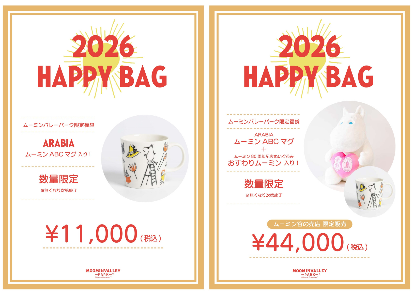 さらに冬の定番アクティビティ、「ムーミン谷のスケートリンクon The LAKE」も大好評営業中!ゆきあそびやスケートで冬のアクティビティを全力で楽しんだあとは、レストランで休憩したり、ショップでゆっくりお買い物をお楽しみいただけます。2026年1月1日(木)~1月5日(月)には2種類のHAPPY BAGを販売。店頭価格80,000円(税込)の「おすわりムーミン」を含めたおよそ10万円相当のグッズが入った福袋はなんと44,000円!ムーミンバレーパーク ムーミン谷の売店のみで販売します。そしてアラビアのABCマグが入った11,000円の福袋はパーク内の売店だけでなく、メッツァビレッジのムーミンバレーパークショップでも販売!超お得な福袋をお見逃しなく。