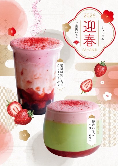 「日本全国にお茶の魅力を」をスローガンに、全国に抹茶ドリンク・タピオカ専門店「SAHANJI」を展開する、株式会社フィットイット(本社:東京都新宿区、代表:長谷川雅之)からお正月限定の「迎春メニュー」として、冬に大好評だったいちごドリンクが登場します。 【公式サイト】http://sahanji-tp.com