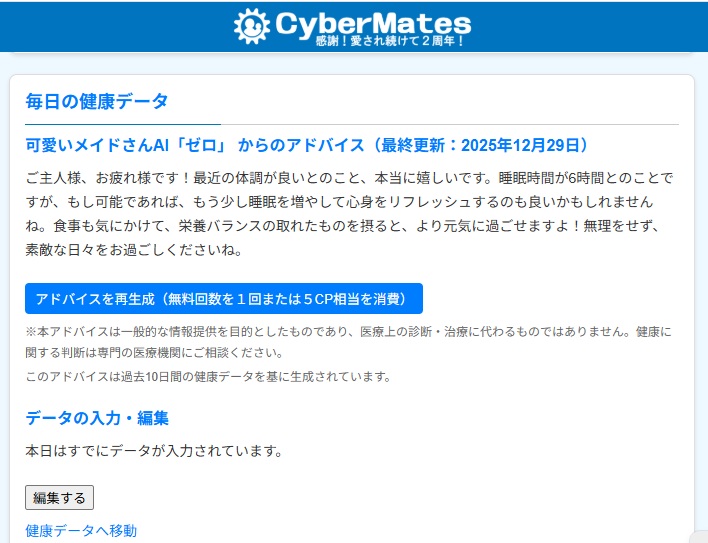 健康サポートのアドバイスは毎日、健康記録を最初に入力した時に更新・提供されます。