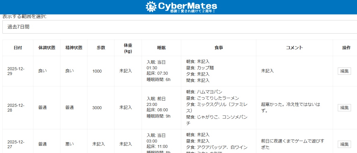 CyberMatesでは、健康管理を“数値を管理する作業”としてではなく、メイトとの会話の延長として自然に続けられる体験 として設計しました。