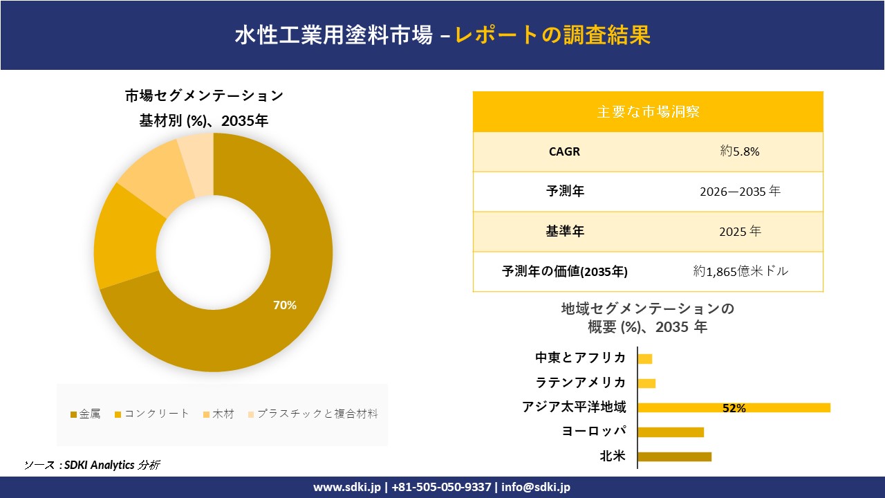 東京都渋谷区、2025年12月30:SDKI Analyticsはこのほど、「 水性工業用塗料市場に関する調査レポート : 予測2026―2035年」を発行しました。調査レポートは、 水性工業用塗料市場の成長に貢献する統計的および分析的アプローチに焦点を当てています。当社の読者は、現在の市場シナリオに関する明確なイメージを得るとともに、詳細な調査レポートで提供される主要な業界の洞察から将来の傾向についても理解します。水性工業用塗料市場に関するこの調査レポートは、一次調査方法と二次調査方法の両方を利用して、市場の成長に伴う現在および将来の市場動向を分析します。