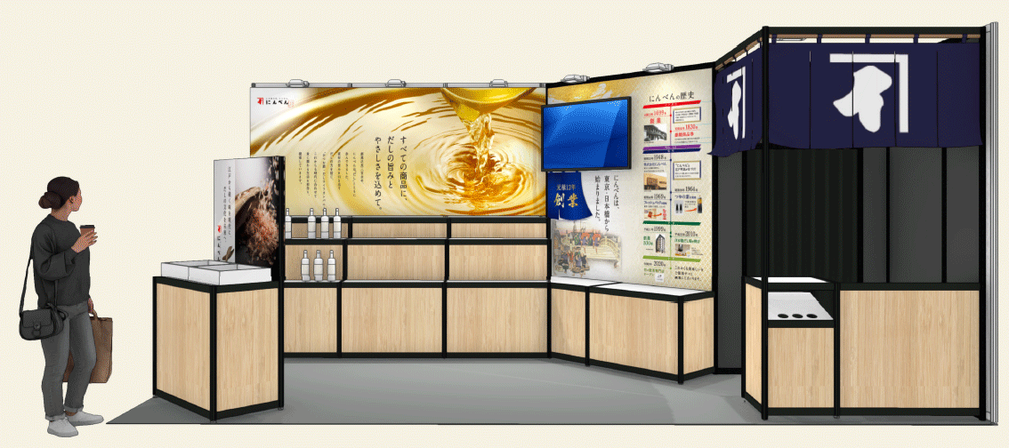 本展示では、歴史と文化を受け継いだだしの価値を体感できるブース構成とし、にんべんの取り組みを具体的な商品と空間を通じて発信します。
