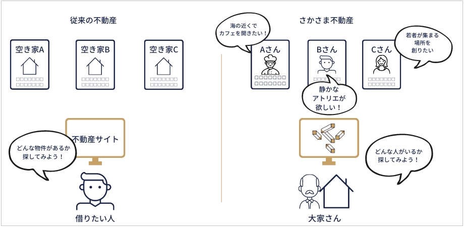 空き家を借りたい人の想いを公開し、共感した不動産オーナーや地域が借り手を選ぶ仕組み。「誰にでも貸したいわけではない」という物件所有者の心情に寄り添い、潜在物件を掘り起こしてきました。